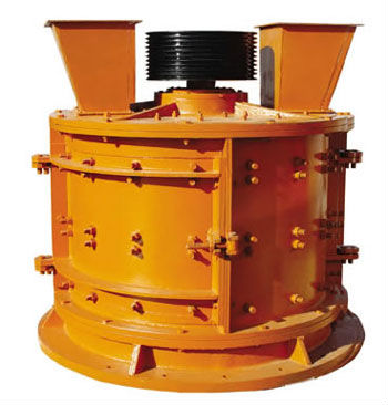 物料由机器上部垂直落入高速旋转的叶轮内,在高速离心力的作用下,与另一部分以伞状形式分流在叶轮四周的物料产生高速撞击与粉碎,物料在互相撞击后,又会在叶轮和机壳之间以物料形成涡流多次的互相撞击、摩擦而粉碎,从下部直通排出,形成闭路多次循环,由筛分设备控制达到所要求的成品粒度。